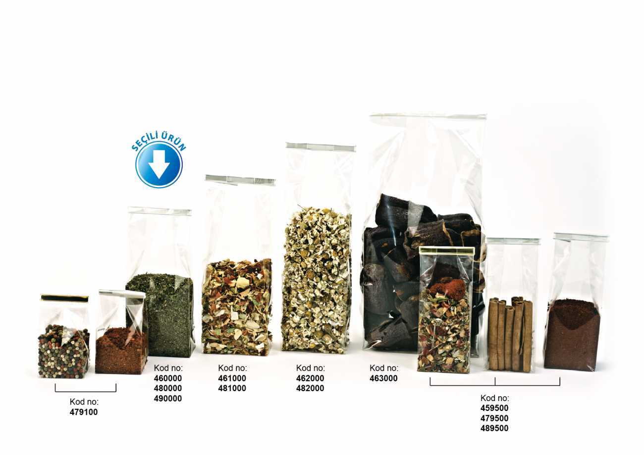 Kullanım Alanları: Şeffaf oturan poşetler kahve, çay, doğal ürünler, kraker, peynir, kurabiye, kuru meyve, şekerleme, cips, fındık,